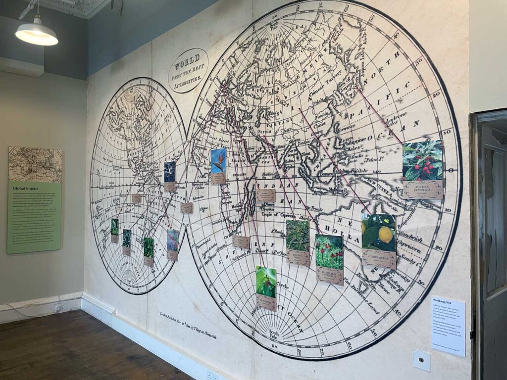 A key part of the book is a list of the 5000 plants that were growing at Croome at the time of publication. Each plant entry contains its origin, which illustrates how far collectors went to get new and exotic plants, many of which came from colonised countries. Using a historic font, we recreated part of the list and designed an impactful wallpaper that was printed and installed floor to ceiling to act as background to contemporary artworks by a local botanical illustration group. Finally, a 18th century World map was sourced to show where plants had come from