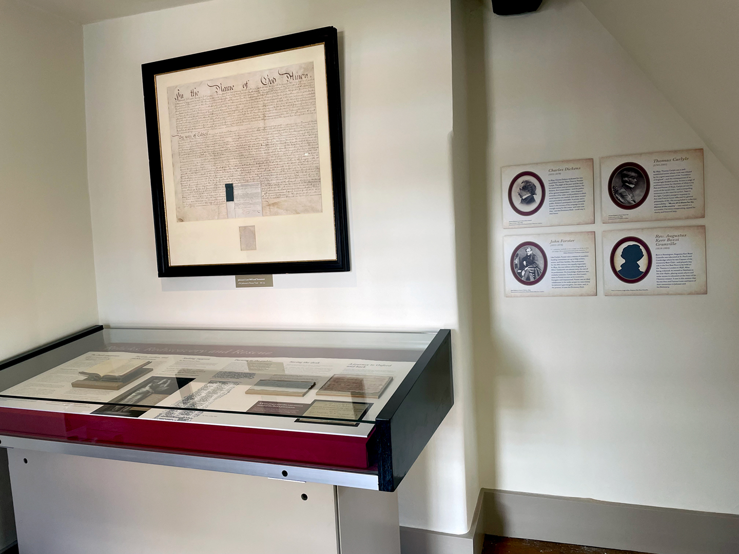 The Garret itself was a tricky space to work with, the windows that drew Dr Johnson to the house, limited wall space, as did the height of the eaves. We used a freestanding toblerone to create extra display space and created a false wall to hold a panel (this also created a tidy storage space behind!). And getting equipment and large boards up five flights of stairs kept our steps up!